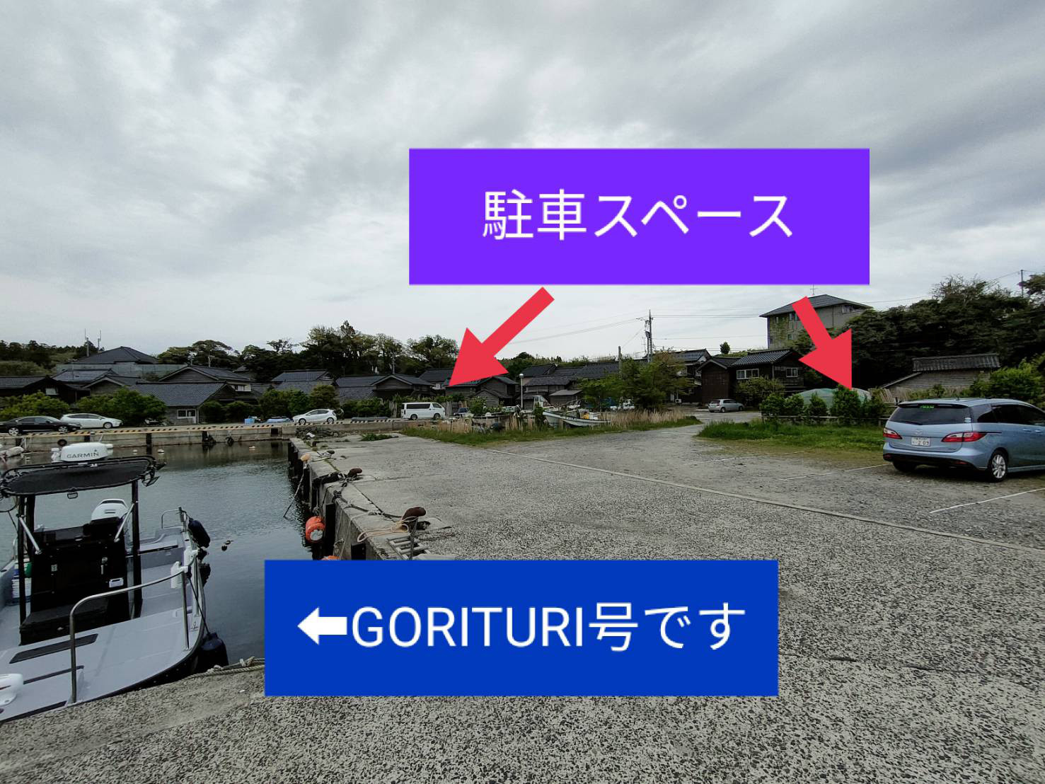 船の場所は駐車場すぐ近くになります。